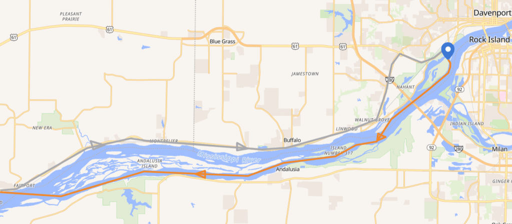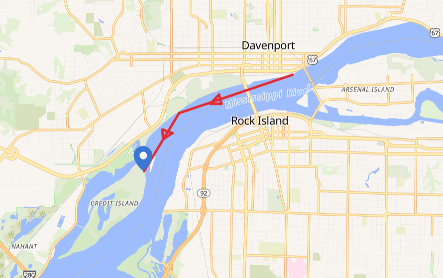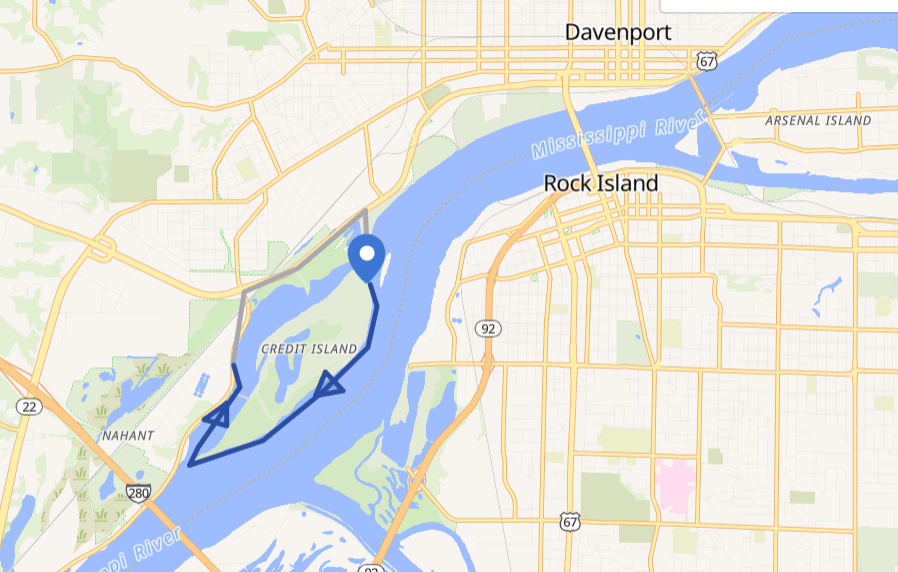 Trip from downtown Davenport to Credit Island. Meet at Credit Island. Typically runs Tuesday and Thursday evening and Saturday morning.